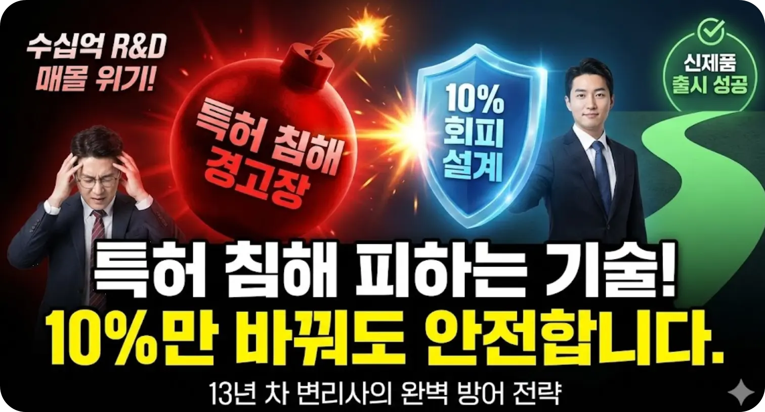 "블로그 보고 회피 설계 문의드립니다"라고 말씀해 주시면, 13년 차 변리사인 제가 직접 전산망을 통해 경쟁사 특허의 빈틈과 회피 설계 가능성을 무료로 1차 진단해 드리겠습니다.