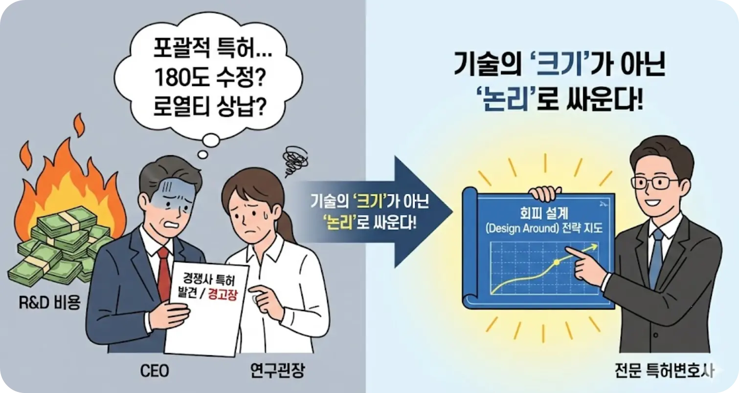 • 해결책: 특허증이라는 '종이 한 장'에 안심할 것이 아니라, 철저하게 상대방의 권리 범위를 우회하는 회피 설계를 선행해야만 진정한 시장 독점이 가능합니다.