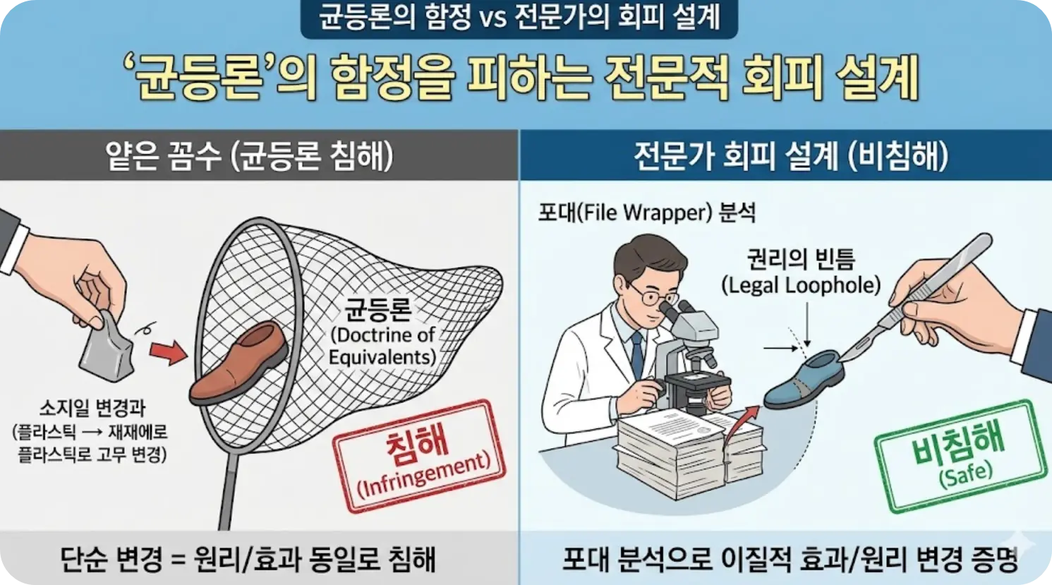 단순히 부품 재질이나 나사 위치를 옮기는 얕은 꼼수로는 부족합니다. 상대방은 법정에 '균등론(Doctrine of Equivalents)'이라는 무기를 들고나와 "재질만 바꿨을 뿐 원리와 효과가 똑같으니 침해다"라고 공격할 것입니다.