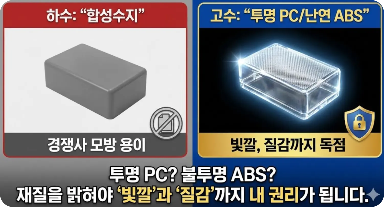 따라서 "투명 폴리카보네이트(PC)", "난연성 ABS 수지"와 같이 구체적인 소재와 그에 따른 시각적 특징(투명, 반투명, 유광, 무광)을 명세서에 정확히 녹여내는 것이 고수의 스킬입니다.