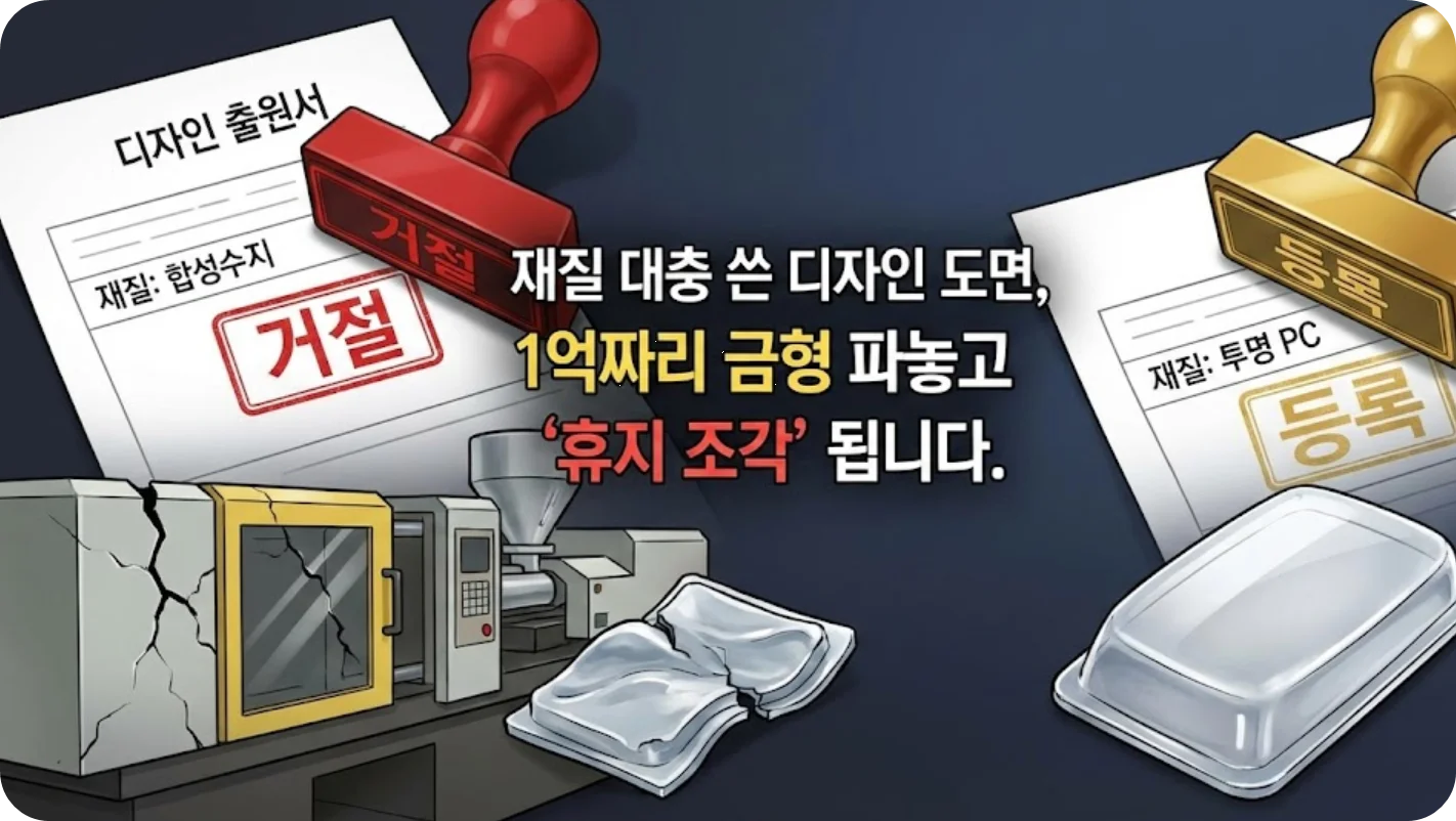 만약 디자인 출원서의 '재질' 란을 이렇게 가볍게 생각하고 계신다면, 죄송하지만 대표님은 지금 거절 결정서를 받거나, 등록되더라도 경쟁사가 재질만 살짝 바꿔서 베껴도 할 말 없는 '껍데기 권리'를 만들고 계신 것과 같습니다.