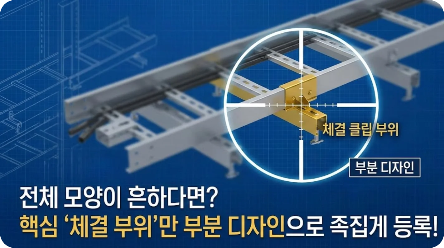 • 전략: 케이블 트레이 전체가 아니라, 독창적인 '체결 클립 부위'나 '코너 라운딩 형상'만을 특정하여 부분 디자인으로 출원합니다.