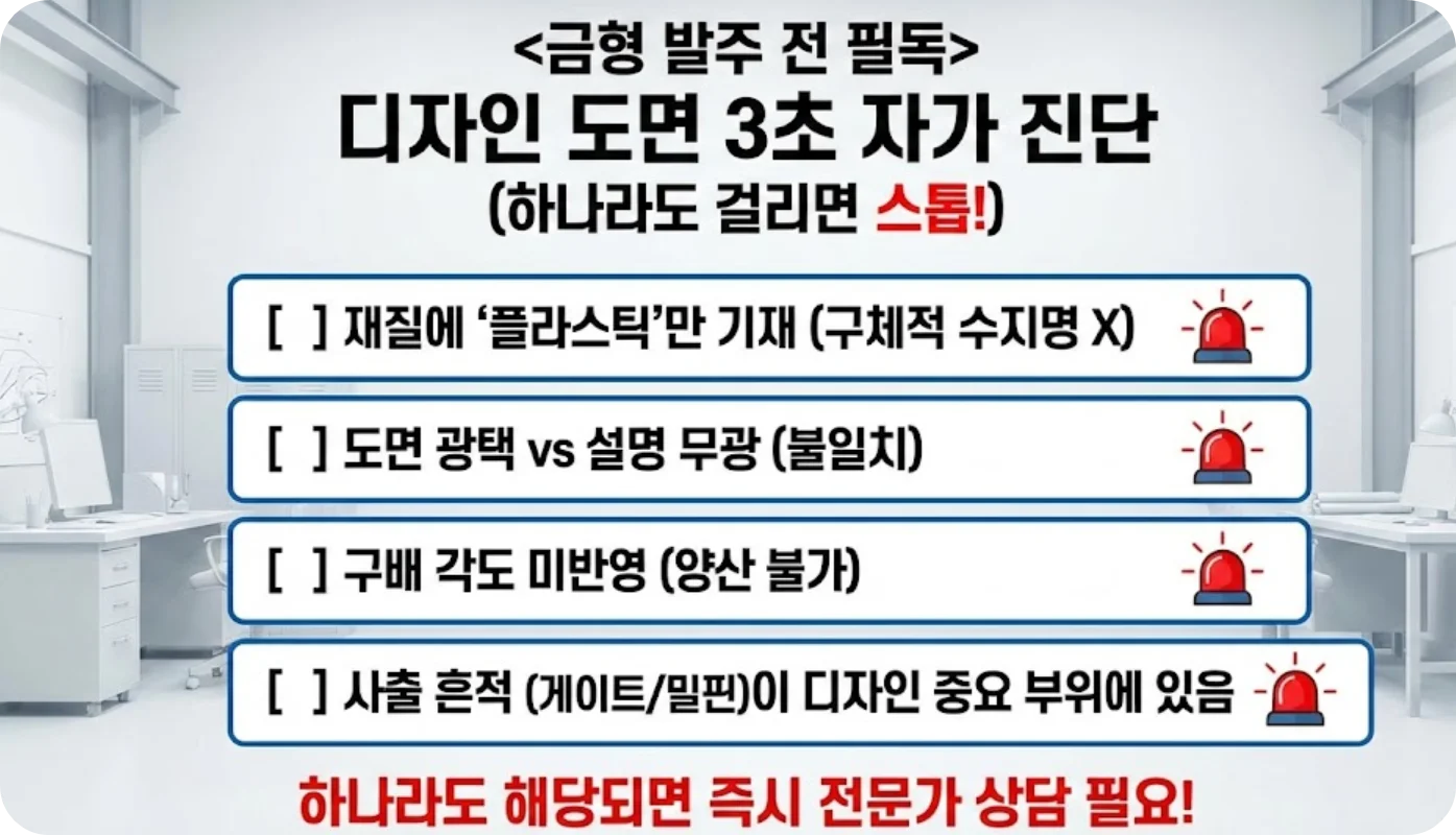 하지만, 금형 설계상 필연적으로 생기는 형상(파팅 라인 등)을 디자인 요소로 잘못 주장하거나, 재질 특성을 고려하지 않은 도면으로 인해 등록 후에도 '실시 불가능한 디자인' 취급을 받을 위험이 있다면 14년 차 전문가의 진단이 필수입니다.
