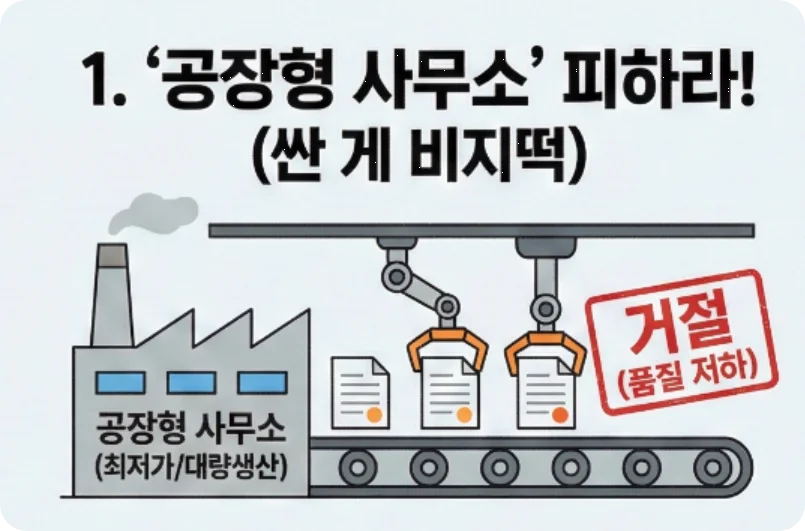 가장 먼저 주의해야 할 곳은 이른바 '공장형 사무소'입니다. 이들은 "업계 최저가", "무조건 등록 보장"을 내세우며 대량의 사건을 수임합니다.