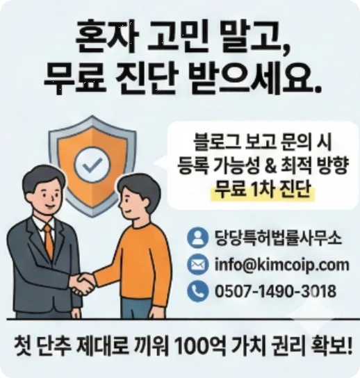 "블로그 보고 변리사사무실 문의드립니다"라고 말씀해 주시면, 제가 직접 대표님 아이템의 등록 가능성과 최적의 권리화 방향을 무료로 1차 진단해 드리겠습니다.