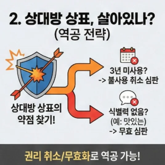 전문가들은 상대방 상표의 약점을 찾아내어 '역공'을 펼칩니다. 대표적인 두 가지 방법은 다음과 같습니다.