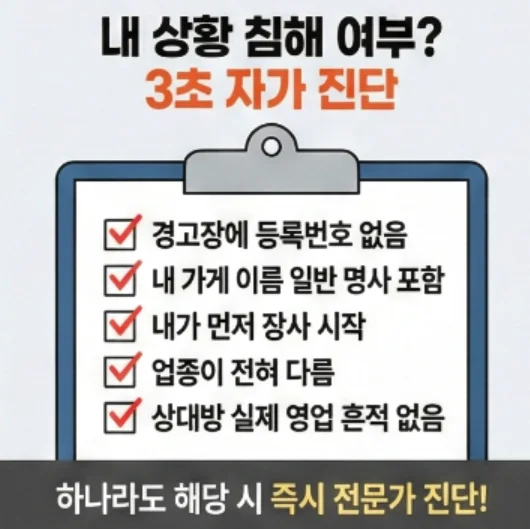 따라서 섣불리 간판을 내리지 마시고, 사업자등록증, 간판 설치 날짜가 찍힌 사진, 거래 명세서, 블로그 포스팅 날짜 등 내가 먼저 사용했다는 증거부터 확보하십시오. 이 증거들이 있다면 합의금 없이 협상을 주도할 수 있습니다.