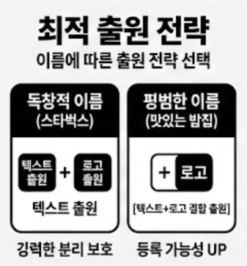• 이름이 평범한 경우 (예: 맛있는 밥집): 텍스트와 로고를 결합하여 하나의 이미지로 출원해야 합니다(1번 전략). 텍스트만으로는 등록이 안 되기 때문에, 로고라는 옷을 입혀서 등록 가능성을 높이는 전략입니다.