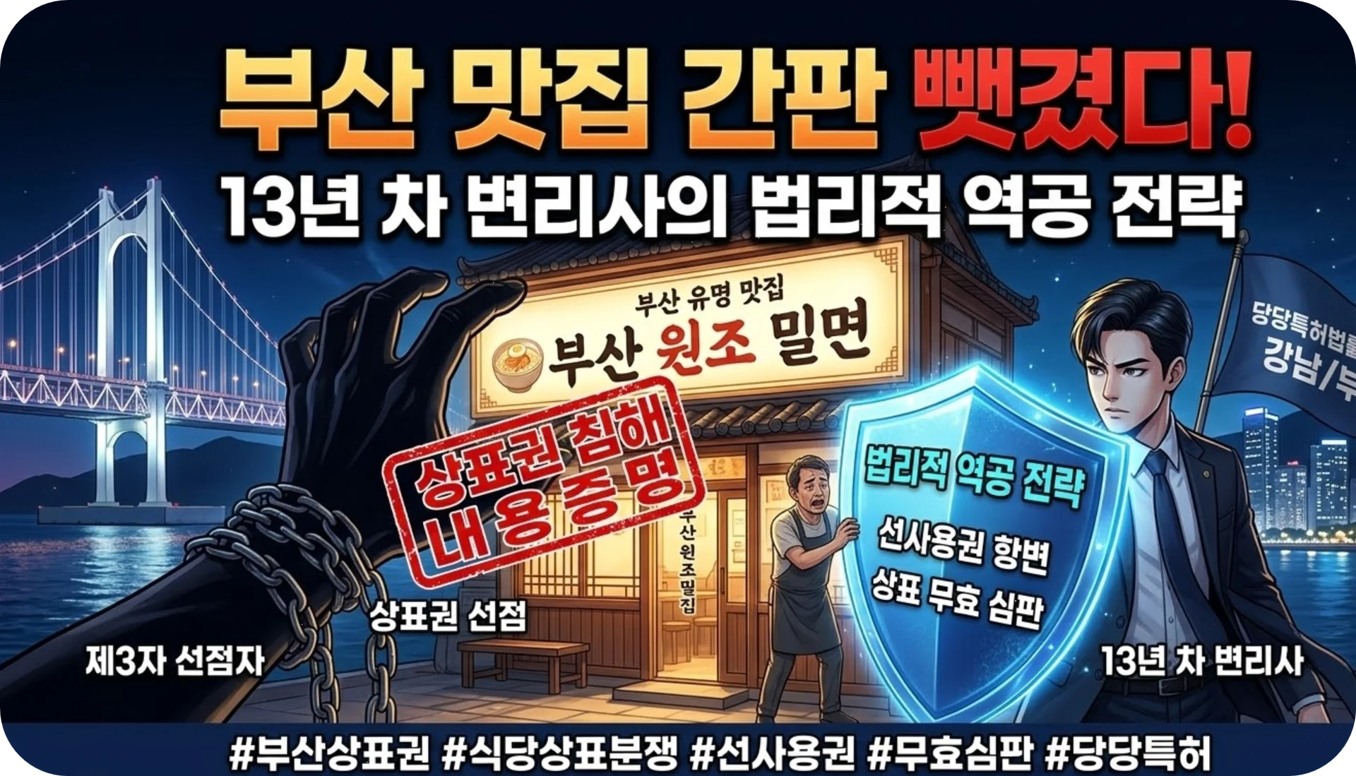 #식당상표권분쟁 #부산식당상표권 #상표권선점대응 #상표등록무효심판 #선사용권항변 #부정경쟁방지법 #상표권도용 #내용증명대응 #변리사 #당당특허법률사무소