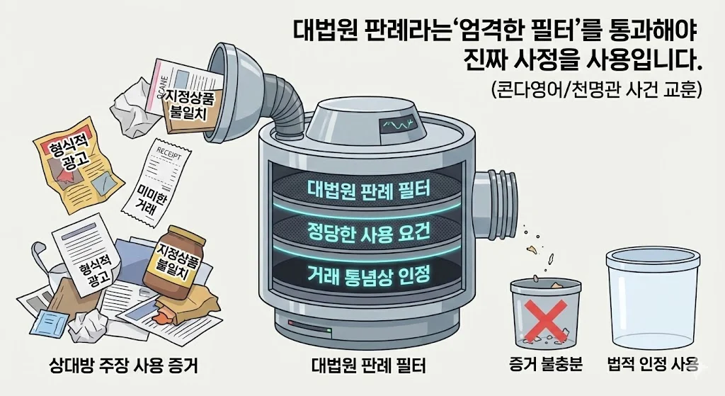 많은 분들이 "인터넷에 검색해 보니 옛날에 팔았던 흔적이 있던데, 그럼 못 없애나요?"라고 묻습니다. 하지만 법원이 인정하는 '상표의 사용'은 생각보다 훨씬 까다롭습니다.