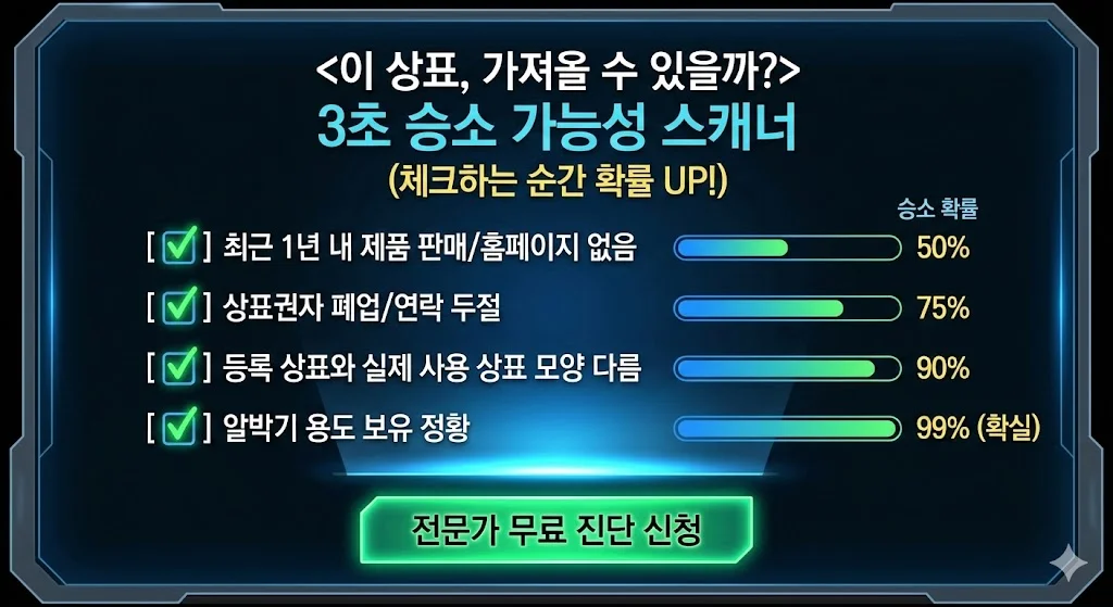 "블로그 보고 불사용 취소 심판 문의드립니다"라고 말씀해 주시면, 14년 차 변리사인 제가 직접 전산망을 통해 승소 가능성과 가장 효율적인 공격 시나리오를 무료로 1차 진단해 드리겠습니다.