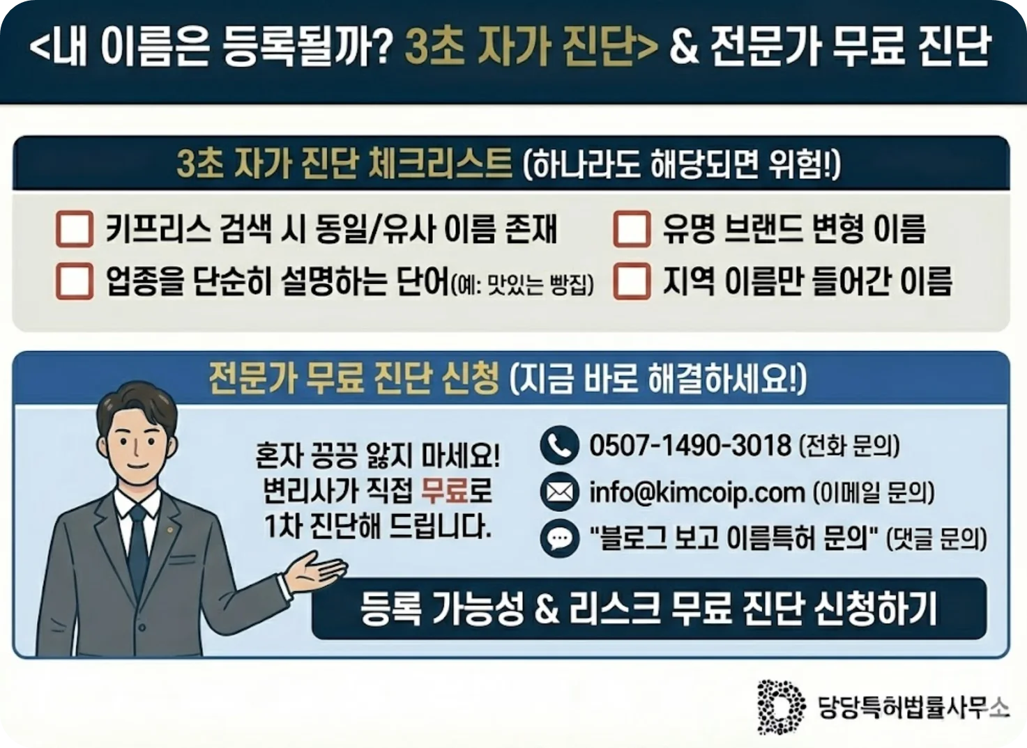 "블로그 보고 이름특허 문의드립니다"라고 말씀해 주시면, 제가 직접 전산망을 통해 대표님 이름의 등록 가능성과 유사 상표 리스크를 무료로 1차 진단해 드리겠습니다.