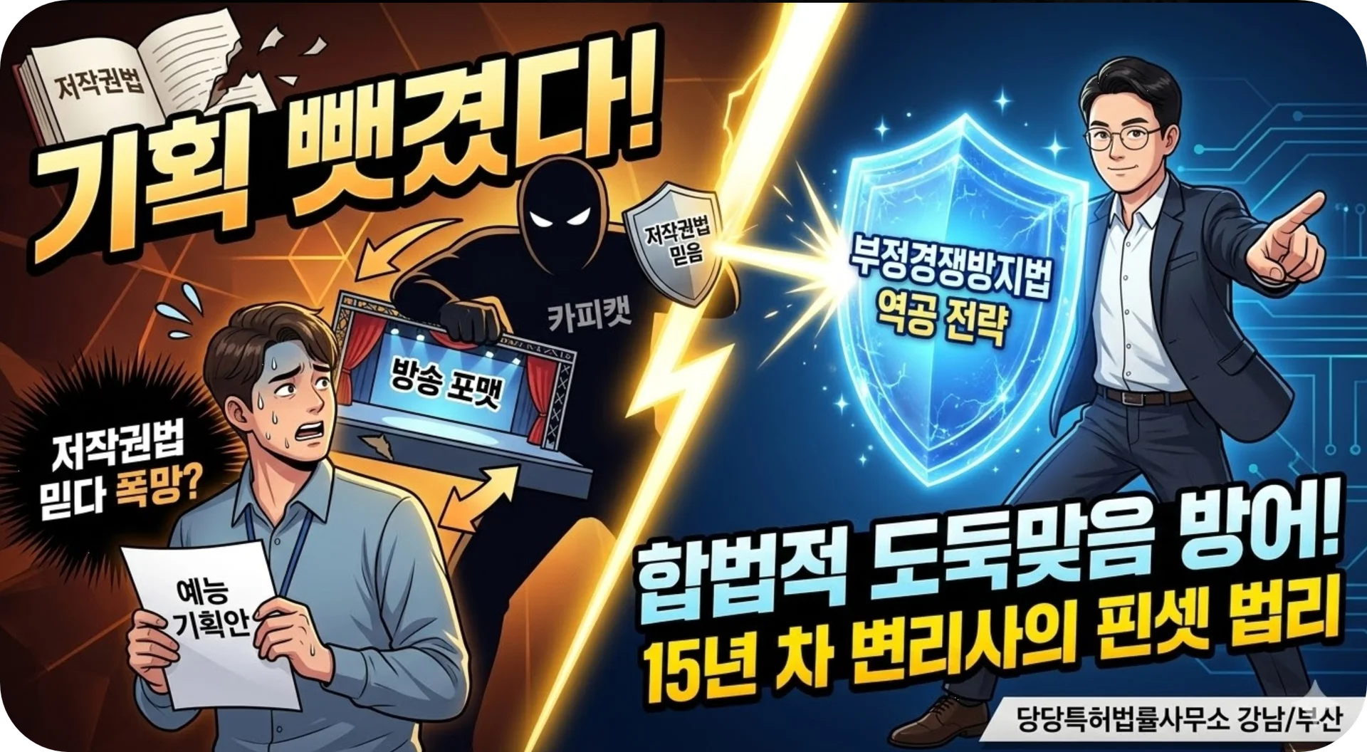 방송포맷저작권 예능프로그램표절 저작권침해소송 부정경쟁방지법 성과도용행위 아이디어표현이분법 지식재산권분쟁 콘텐츠보호 부산변리사 당당특허법률사무소