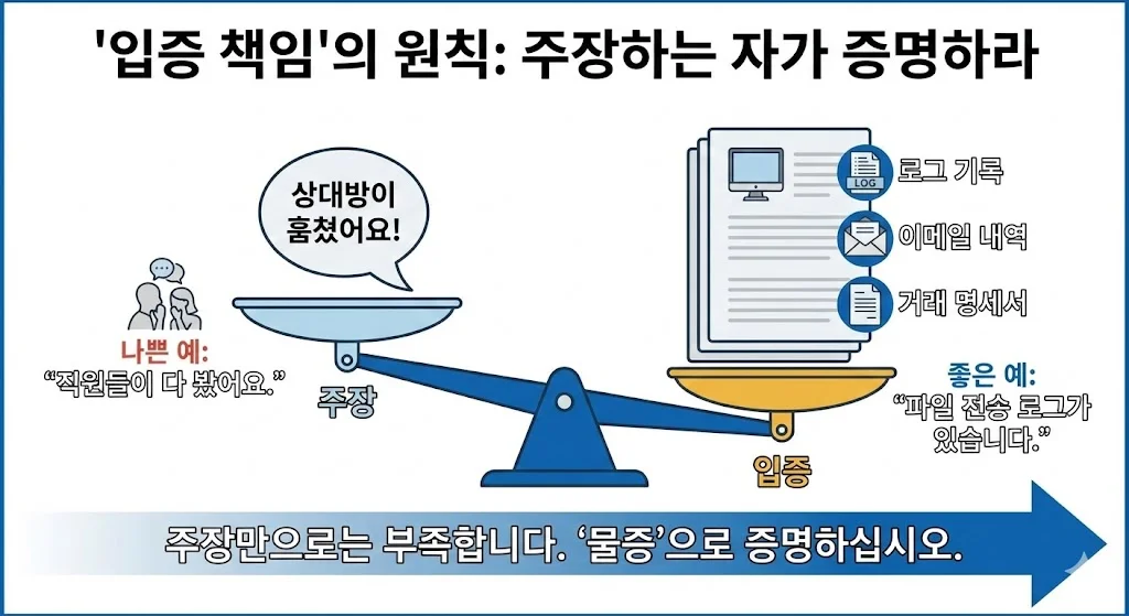 말로 하는 싸움은 술자리에서나 통합니다. 법정에서는 '로그 기록', '이메일 수발신 내역', '거래 명세서'라는 종이 뭉치만이 유일한 무기입니다. 이 무기 없이 소송을 거는 건 맨몸으로 전쟁터에 나가는 자살행위와 같습니다.