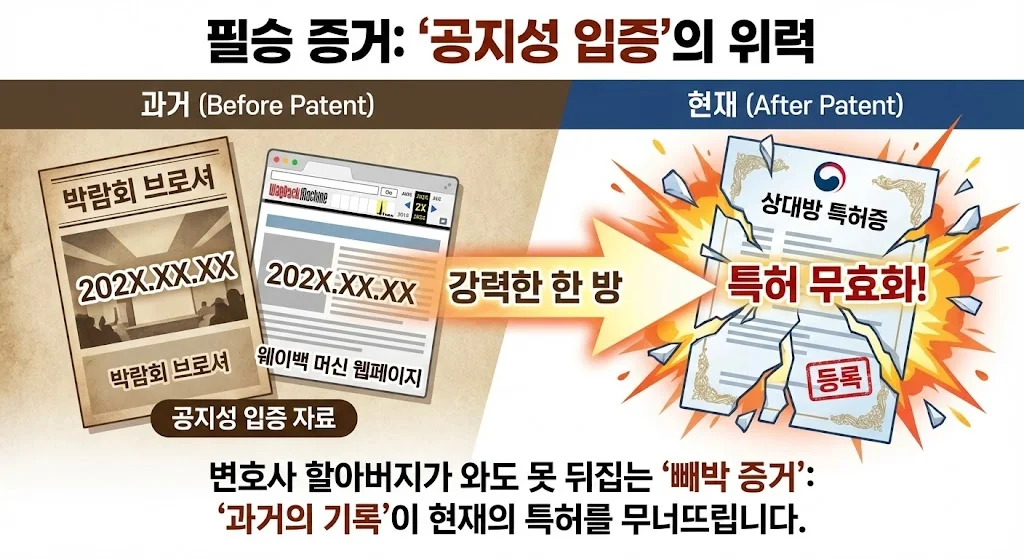 특허 분쟁에서 가장 강력한 한 방은 무엇일까요? 바로 '공지성(Publicity) 입증 자료'입니다.