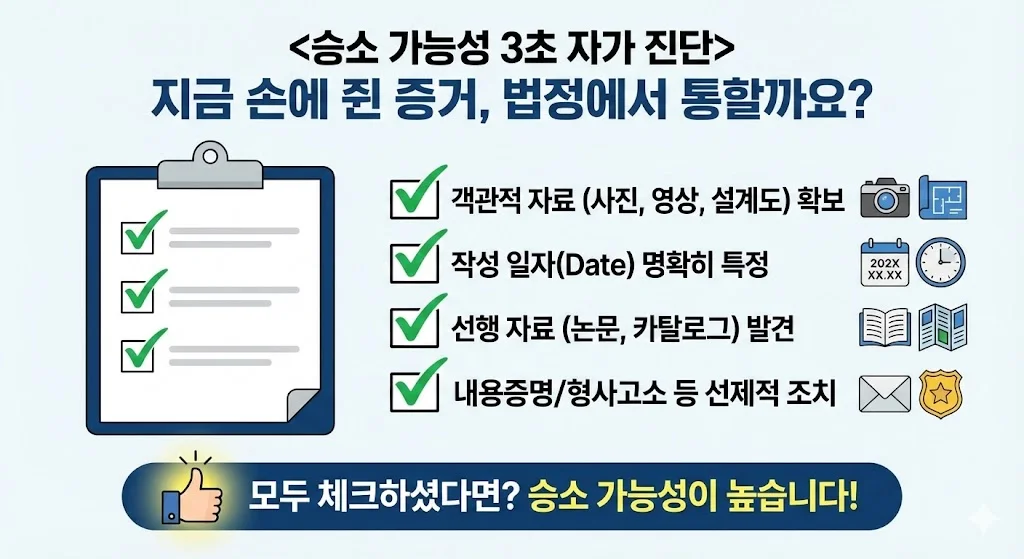 • [ ] 상대방의 침해 행위를 입증할 수 있는 객관적 자료(사진, 영상, 설계도)를 확보했다.