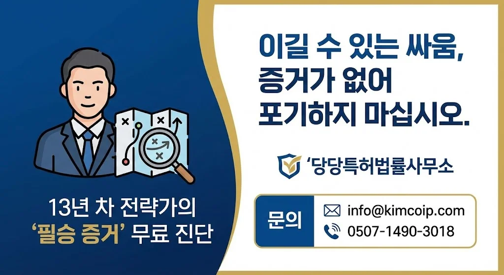 "블로그 보고 증거 수집 문의드립니다"라고 말씀해 주시면, 13년 차 변리사인 제가 직접 전산망을 통해 승소에 필요한 핵심 증거 리스트와 확보 전략을 무료로 1차 진단해 드리겠습니다.