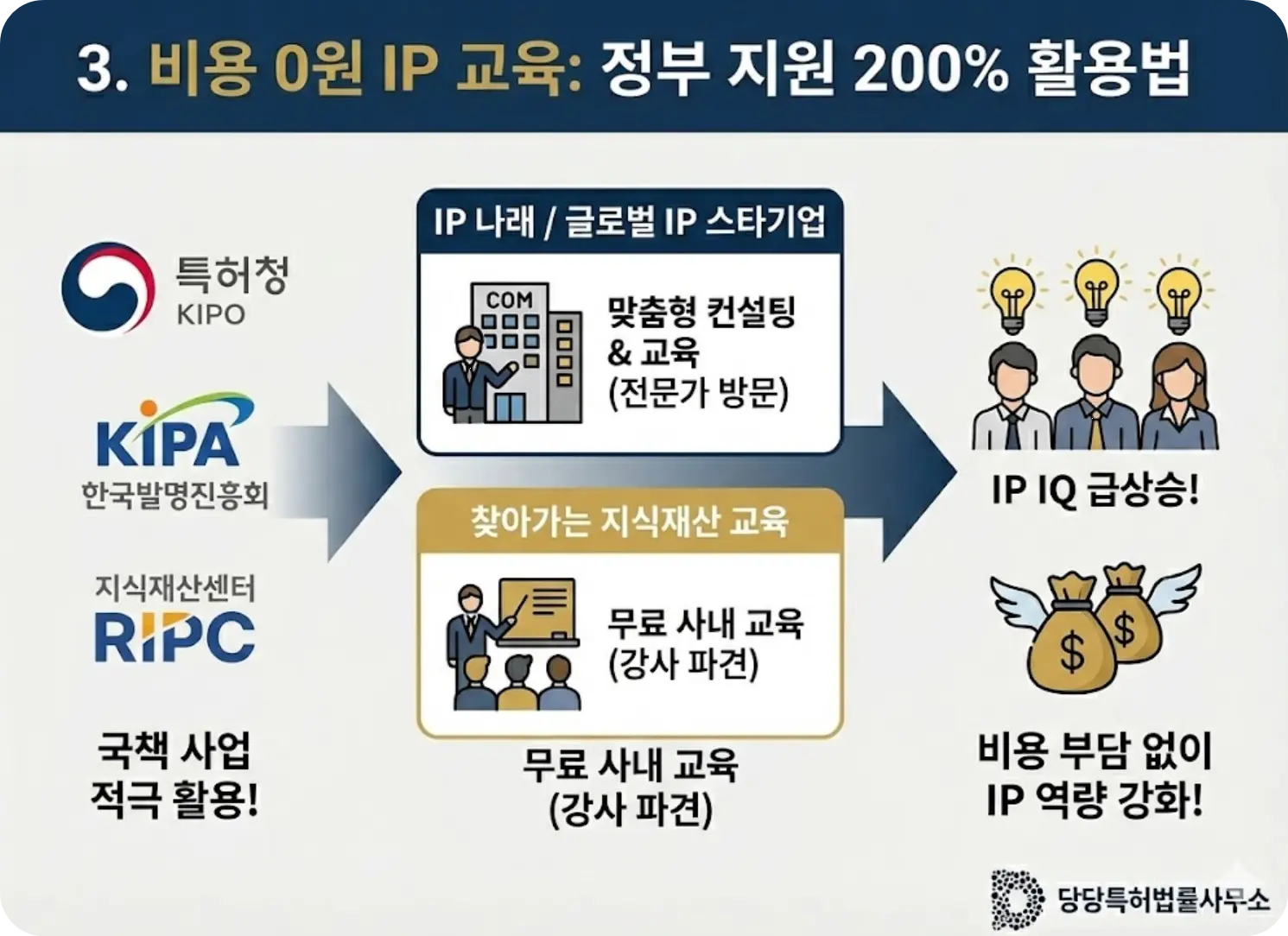 이러한 국책 사업을 적극 활용하면, 비용 부담 없이 직원들의 'IP IQ(지식재산 지능)'를 획기적으로 높일 수 있습니다.