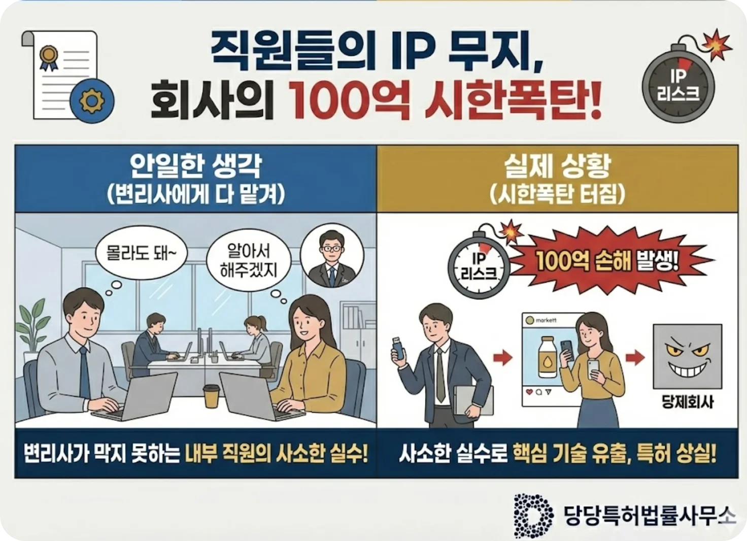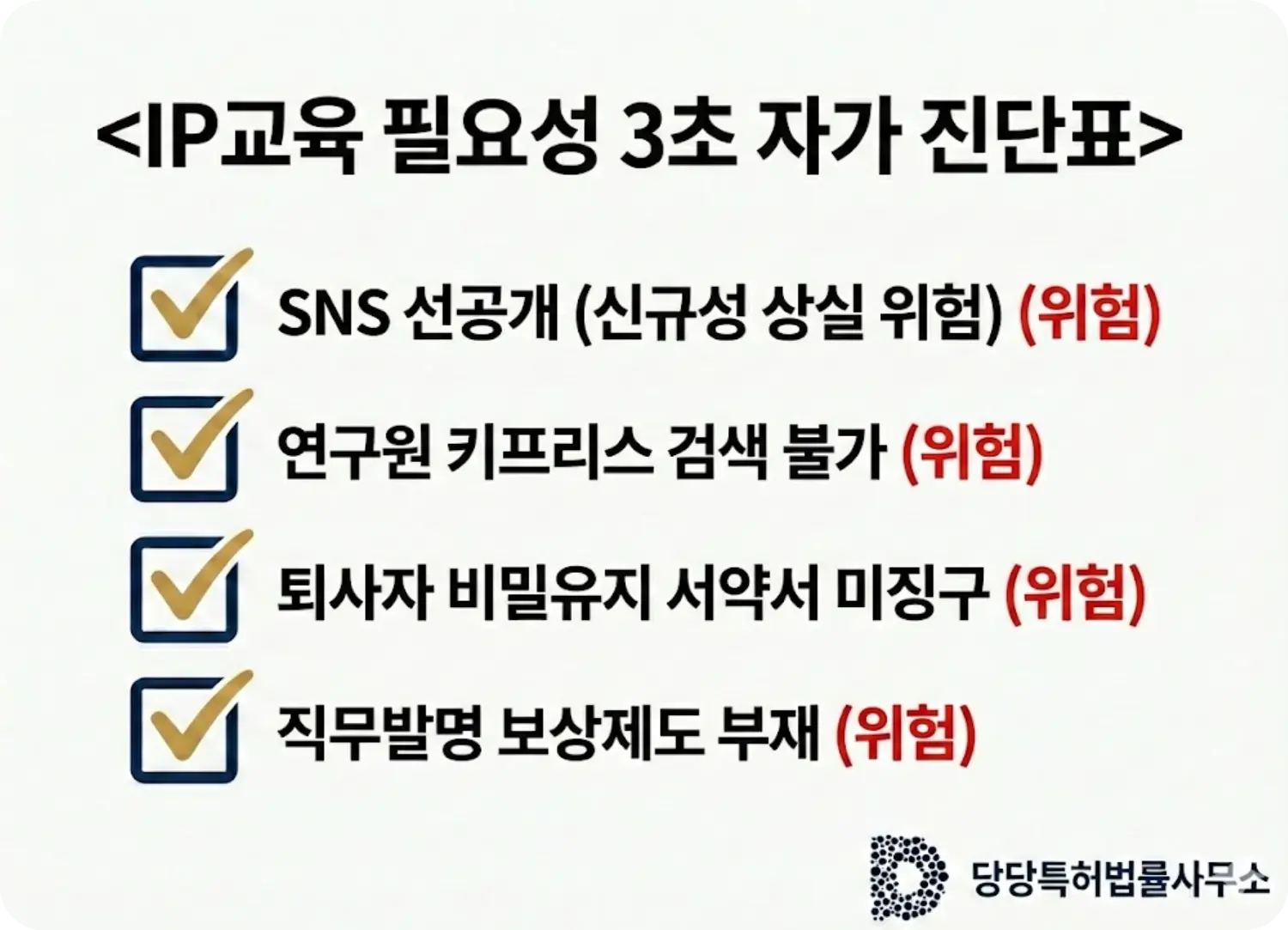 하지만, 지식재산권은 '아는 것이 힘'이 아니라 '모르는 것이 죄'가 되는 냉혹한 비즈니스 영역입니다. 직원 한 명의 무지로 100억짜리 기술이 공공재가 되어버리는 비극은 없어야 합니다.