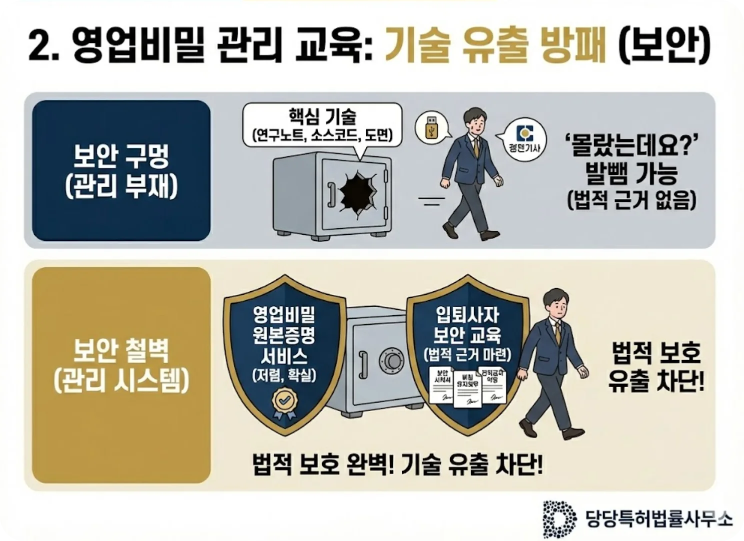 이 교육이 되어있지 않으면, 직원이 경쟁사로 이직해 우리 기술을 그대로 써도 "그게 비밀인 줄 몰랐는데요?"라고 발뺌할 때 처벌할 근거가 사라집니다.