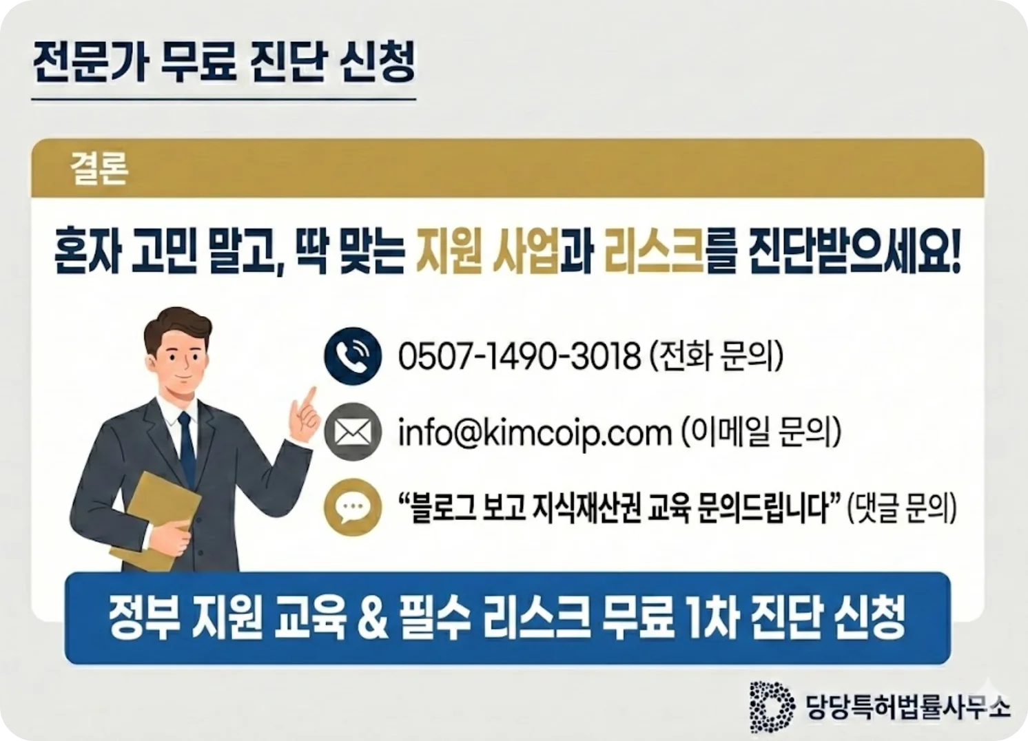 "블로그 보고 지식재산권 교육 문의드립니다"라고 말씀해 주시면, 제가 직접 전산망을 통해 귀사의 업종과 규모에 딱 맞는 정부 지원 교육 프로그램과 필수 관리 리스크를 무료로 1차 진단해 드리겠습니다.