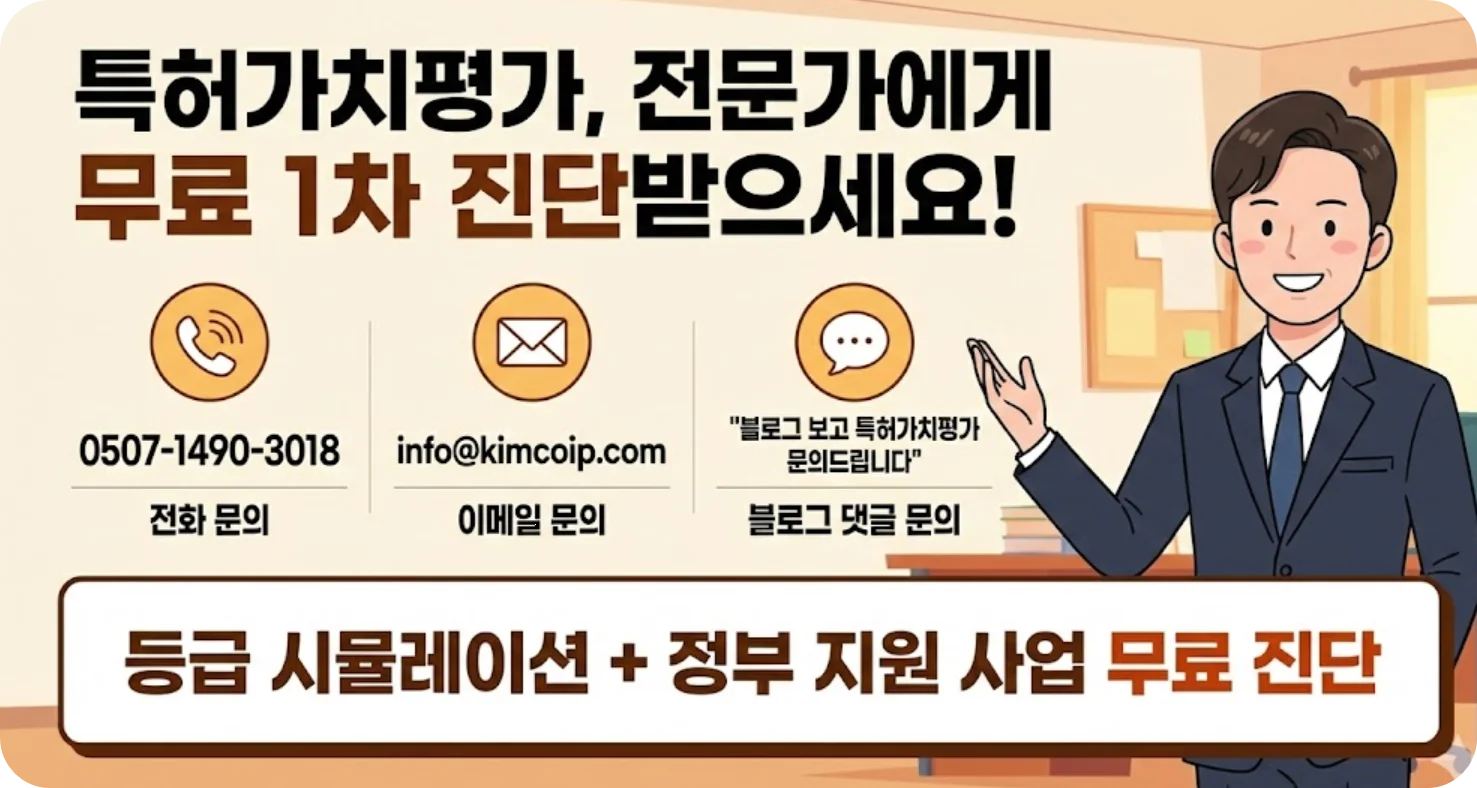 "블로그 보고 특허가치평가 문의드립니다"라고 말씀해 주시면, 제가 직접 전산망을 통해 대표님 특허의 등급 시뮬레이션과 활용 가능한 정부 지원 사업(평가 비용 지원)을 무료로 1차 진단해 드리겠습니다.