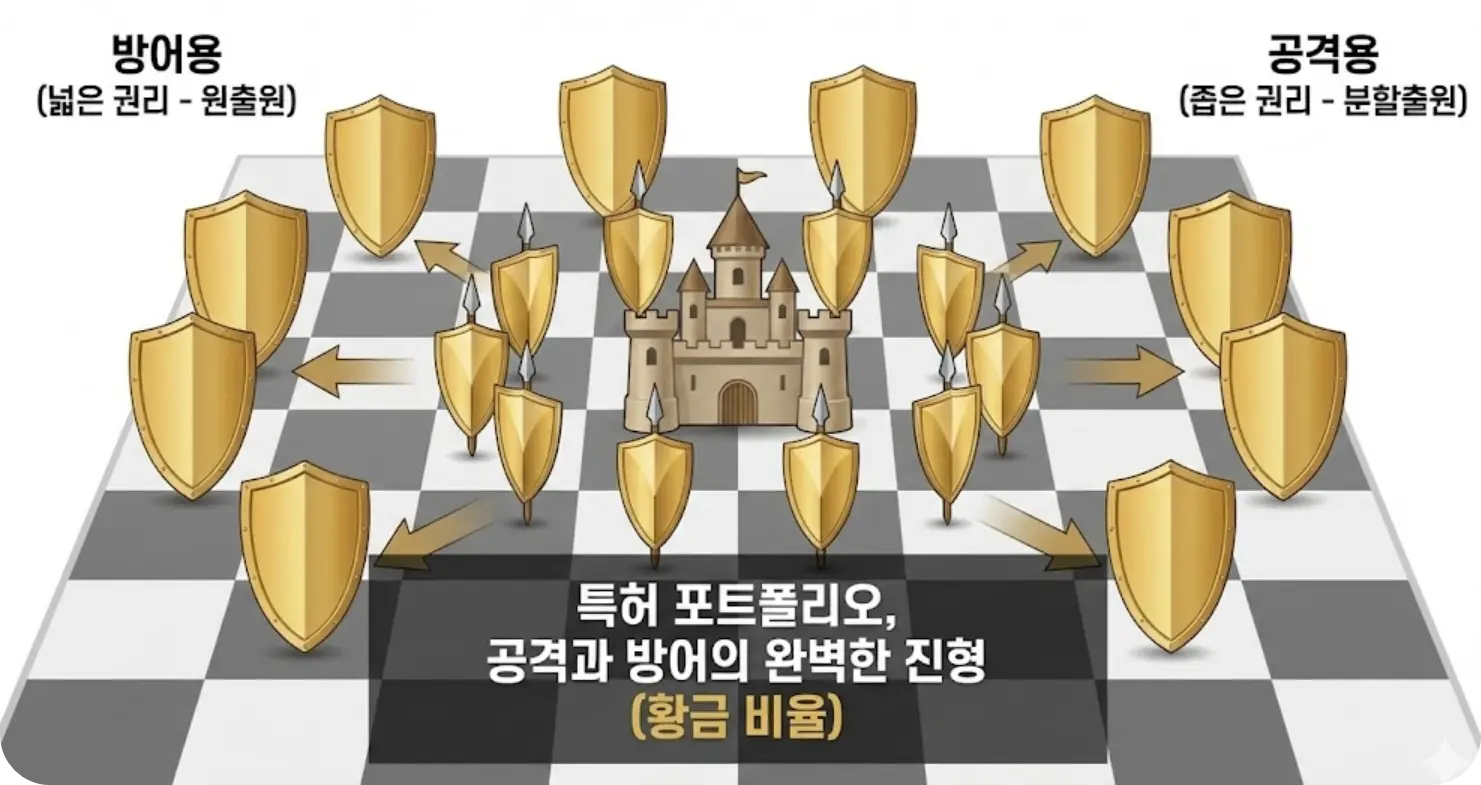 2. 회피 설계 방어: 우리 특허가 등록되더라도 경쟁사가 쉽게 회피할 수 있다면 무용지물입니다. 진보성을 인정받기 위해 구성요소를 너무 많이 한정하면 권리 범위가 좁아집니다. 따라서 넓은 권리(방어용)와 좁고 강력한 권리(공격용)를 섞어서 포트폴리오를 구성해야 합니다.