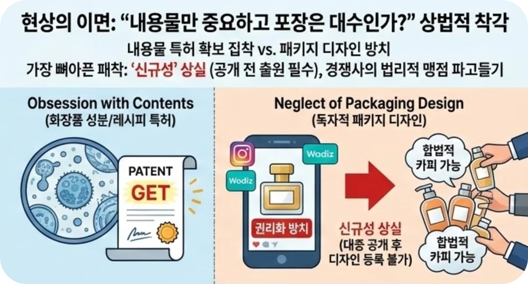많은 스타트업과 제조 기업이 내용물(화장품 성분, 식품 레시피 등)의 특허 확보에는 집착하면서도, 정작 소비자가 지갑을 여는 결정적 트리거인 '패키지 디자인'의 권리화는 방치합니다.