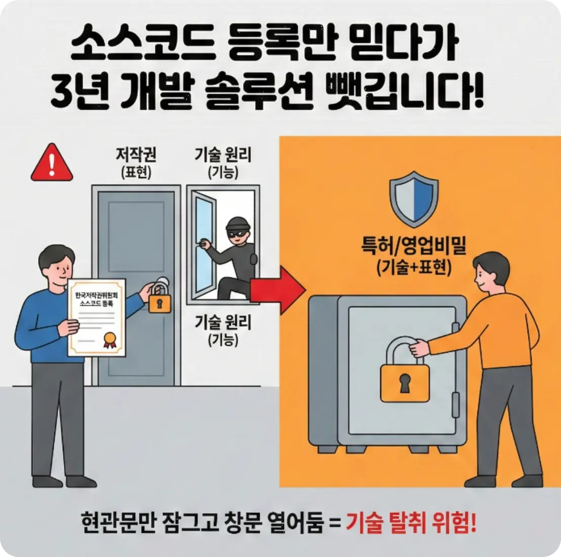 만약 이렇게 안심하고 계신다면, 죄송하지만 대표님은 지금 현관문(저작권)만 잠그고 창문(기술 원리)은 활짝 열어둔 채 외출하는 것과 다름없습니다.