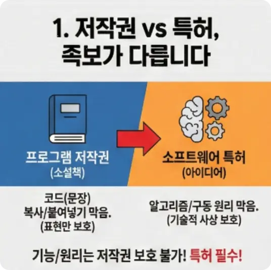 • 프로그램 저작권 (한국저작권위원회): 소설책과 같습니다. '문장(소스코드)' 그 자체를 베끼는 복사/붙여넣기는 막을 수 있습니다. 하지만 누군가 내 프로그램의 기능을 보고 "아, 이런 원리구나!" 하고 파악해서, 다른 코드(문장)로 똑같은 기능을 구현한다면? 저작권 침해가 성립하지 않습니다.