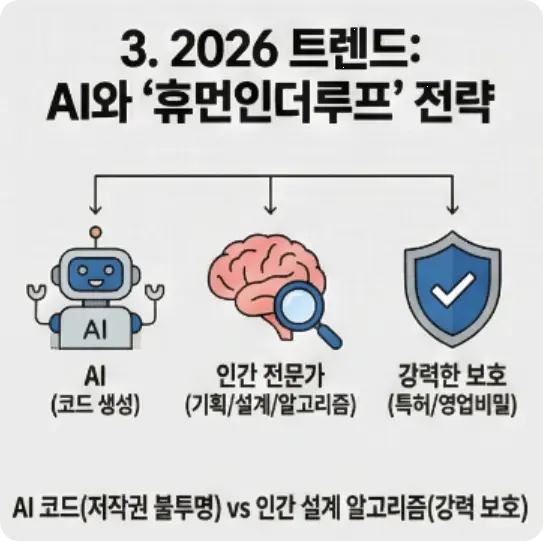 AI가 생성한 코드는 저작권 인정 여부가 불투명하지만, 사람이 기획하고 설계한 '알고리즘'은 여전히 강력한 보호 대상입니다.