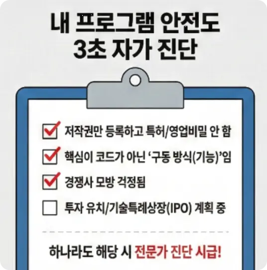 "블로그 보고 프로그램저작권 문의드립니다"라고 말씀해 주시면, 제가 직접 전산망을 통해 대표님 프로그램에 딱 맞는 최적의 권리 보호 포트폴리오(특허 vs 저작권 vs 영업비밀)를 무료로 1차 진단해 드리겠습니다.