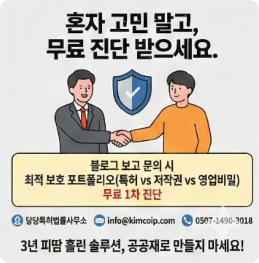 하지만, 내 아이템이 특허로 보호받아야 할지, 영업비밀로 숨겨야 할지, 저작권으로 충분할지 전략을 세우지 않고 무작정 런칭부터 하셨다면 전문가의 긴급 진단이 필요합니다.