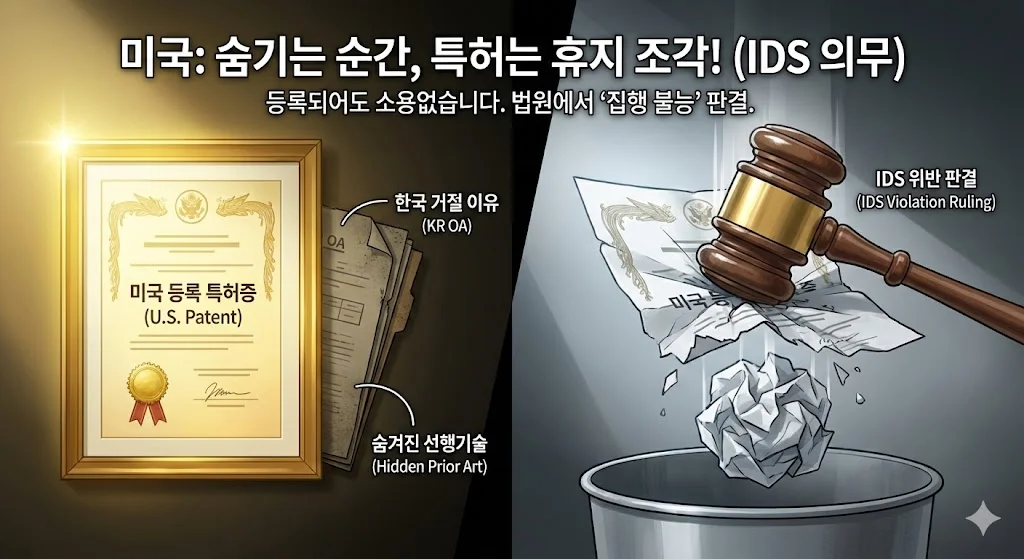 • 위협: 만약 귀찮아서, 혹은 몰라서 한국 특허청에서 받았던 거절 이유를 미국 심사관에게 알리지 않았다가 나중에 발각되면? 특허는 등록되더라도 법원에서 '집행 불능(Unenforceable)' 판결을 받아 휴지 조각이 됩니다.