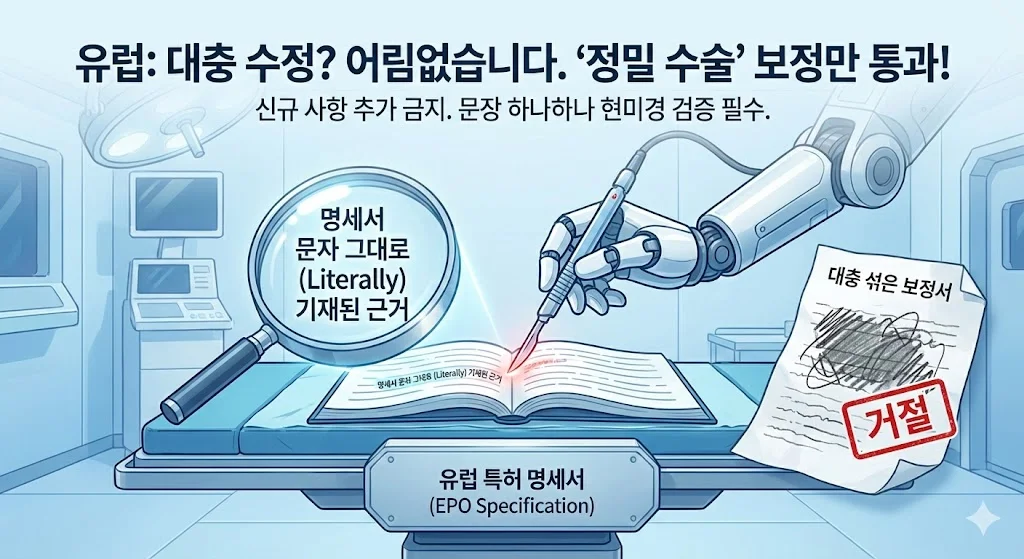 명세서에 문자 그대로(Literally) 기재되어 있지 않은 내용을 유추해서 보정했다가는, 보정 부적법으로 거절당합니다. 한국에서는 융통성 있게 받아들여지는 수준의 수정도 유럽에서는 허용되지 않습니다.