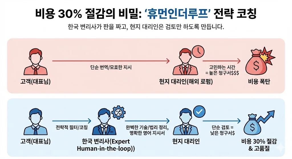 1. 휴먼인더루프 (Human-in-the-loop) 전략: 2026년 트렌드인 '휴먼인더루프'를 기억하십시오[Source 648, 722]. 제가 중간에서 기술적 쟁점과 반박 논리를 영어로 완벽하게 정리(Instructions)해서 현지 대리인에게 보냅니다. 그들은 단순히 법률적 검토만 하면 되도록 만들어, 'Billable Time(청구 시간)'을 획기적으로 줄여드립니다. 이것이 14년 차의 노하우입니다.