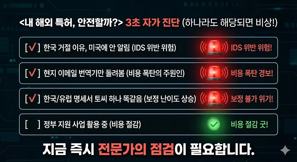 "블로그 보고 해외출원 문의드립니다"라고 말씀해 주시면, 14년 차 변리사인 제가 직접 전산망을 통해 현재 대응 전략의 적절성과 비용 절감 시나리오를 무료로 1차 진단해 드리겠습니다.