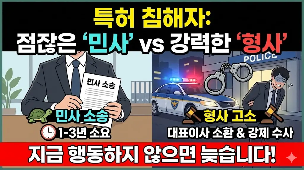 냉정하게 말씀드립니다. 특허 침해자에게 민사 소송은 '돈'의 문제일 뿐입니다. 그들이 가장 두려워하는 것은 돈이 아니라, 자신의 몸이 경찰서에 불려 가고 '전과자'가 되는 것입니다.