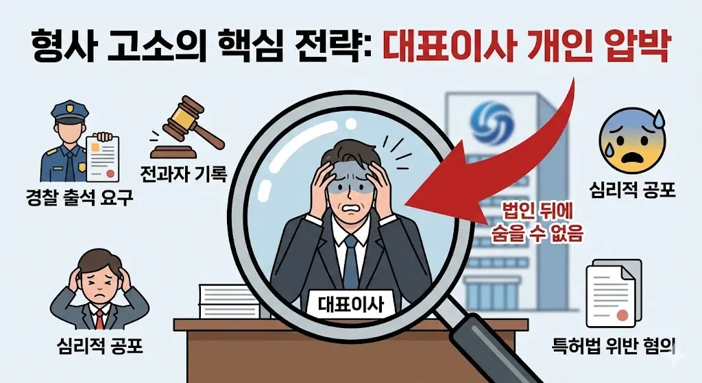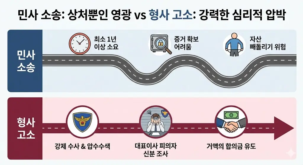 1. 대표이사 소환: 법인 통장으로 합의금을 내면 그만인 민사와 달리, 형사 고소는 상대방 대표이사가 피의자 신분으로 경찰서에 출석하여 조사를 받아야 합니다. 이는 엄청난 스트레스와 공포를 줍니다.
