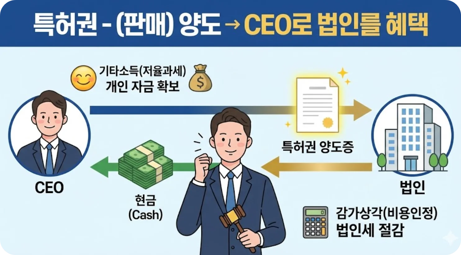 • 법인의 이점 (비용 처리): 법인은 대표님에게 지급한 특허 매입 비용을 무형자산으로 장부에 계상하고, 이를 매년 감가상각하여 비용(손금)으로 처리할 수 있습니다. 즉, 법인세를 합법적으로 크게 줄일 수 있는 수단이 됩니다.