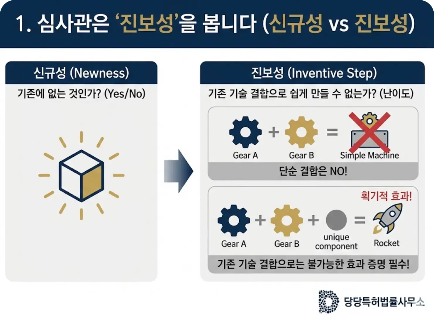 많은 분들이 "내 기술은 세상에 없던 새로운 것(신규성)이니 당연히 등록되겠지"라고 생각합니다. 하지만 심사관이 가장 많이 거절하는 사유는 신규성이 아니라 '진보성(Inventive Step)'입니다.