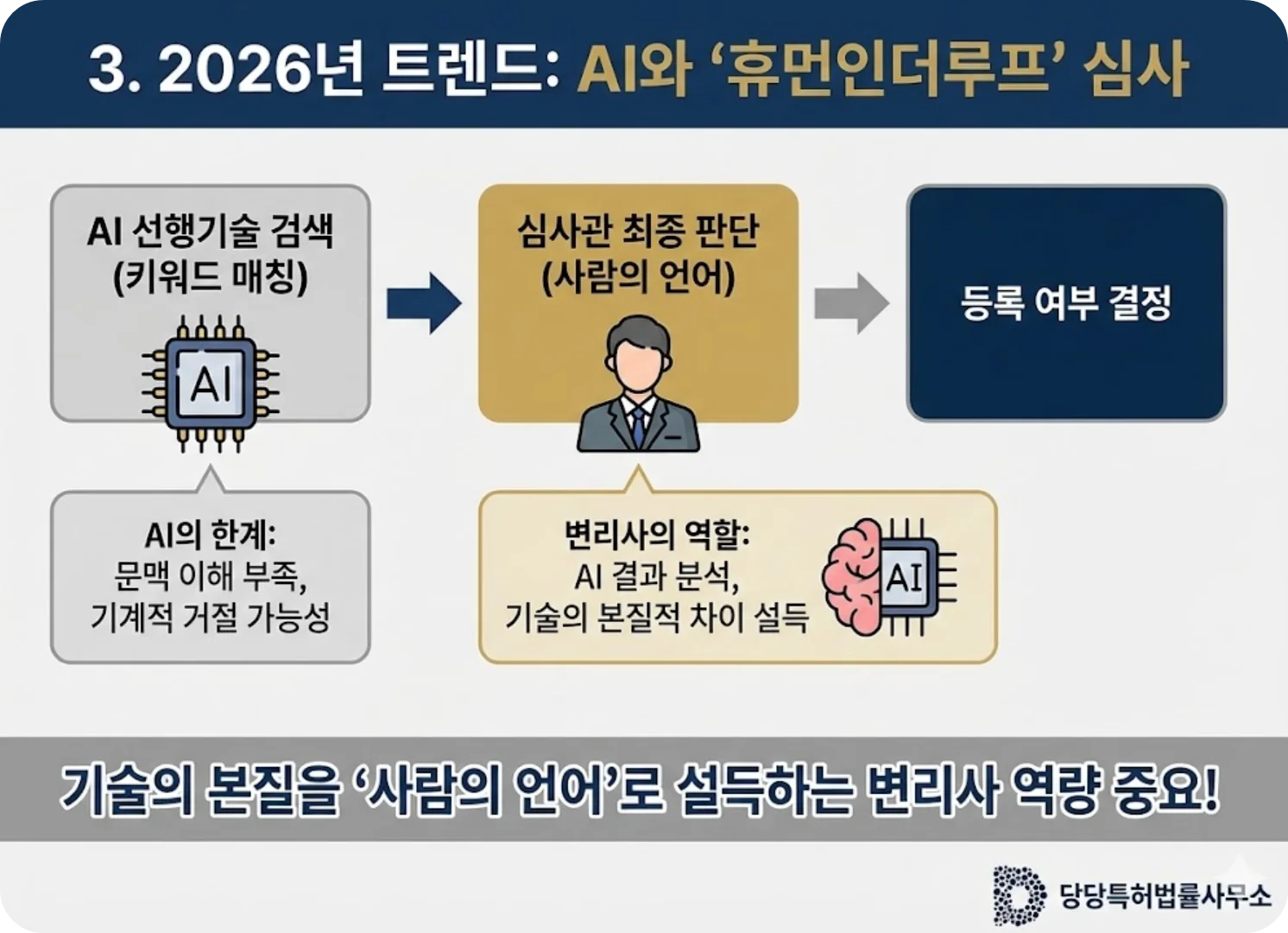 최근 특허청 심사 환경도 급변하고 있습니다. AI가 선행 기술을 찾아주는 시스템이 도입되었지만, 최종 판단은 여전히 '사람(심사관)'이 합니다. 이것이 2026년 트렌드인 '휴먼인더루프(Human-in-the-loop)'의 핵심입니다.