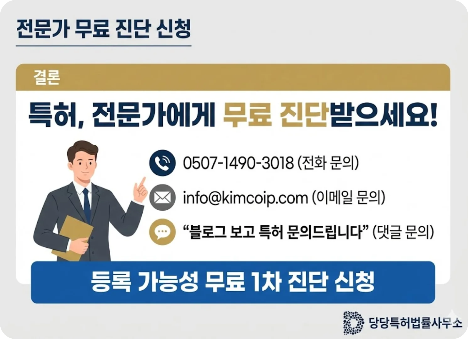"블로그 보고 특허청 심사관 문의드립니다"라고 말씀해 주시면, 제가 직접 전산망을 통해 거절 이유의 타당성과 심사관을 설득할 수 있는 논리적 대응 전략을 무료로 1차 진단해 드리겠습니다.