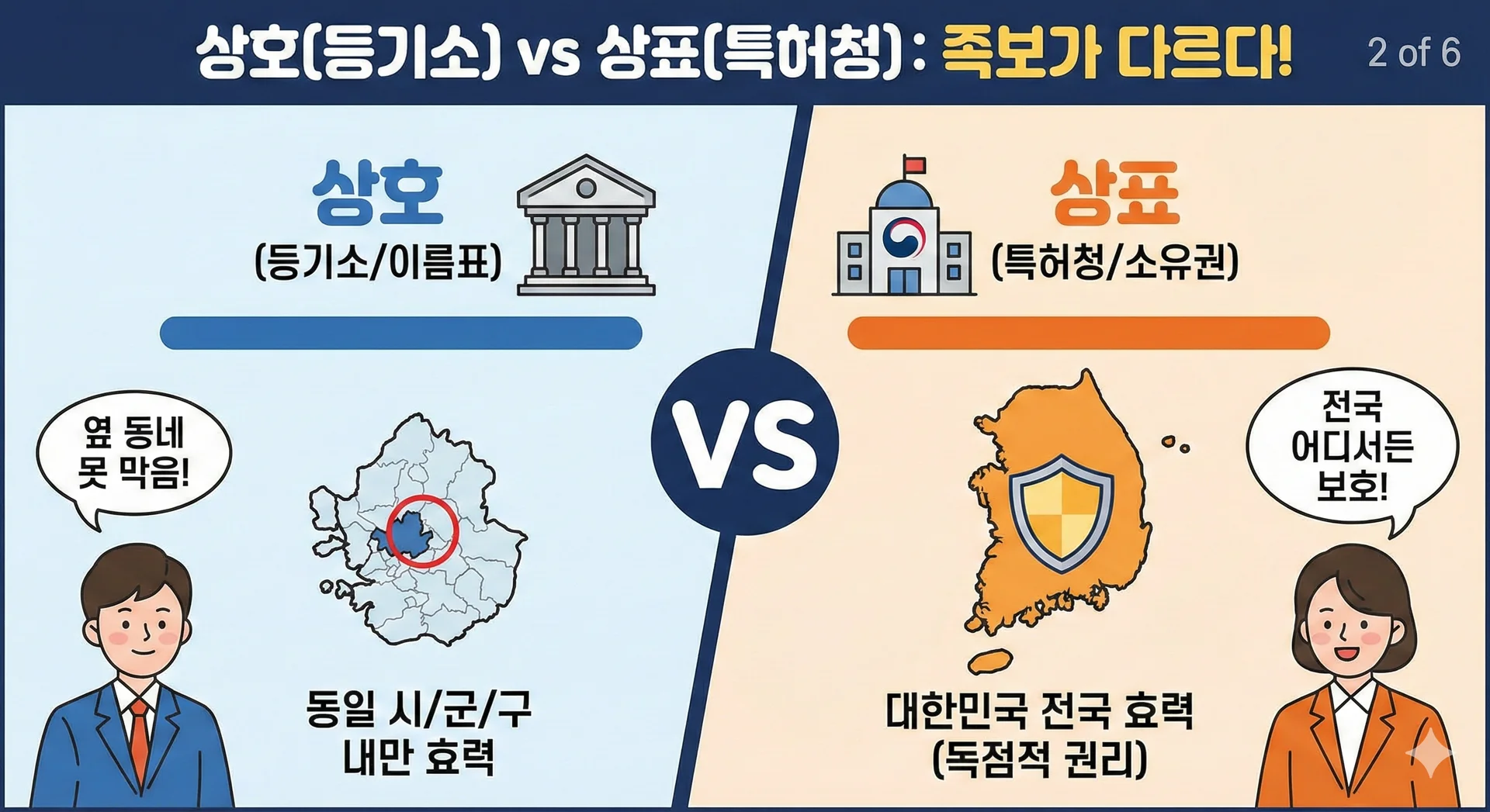 • 상호 (등기소/세무서): '상호'는 사업자의 이름표입니다. 인터넷 등기소에서 검색합니다. 하지만 치명적인 단점은 효력이 '동일 시/군/구' 내에만 미친다는 것입니다. 즉, 서울 강남구에 '대박식당'을 등록해도, 바로 옆 서초구에서 누군가 똑같은 이름을 써도 막을 수 없습니다.