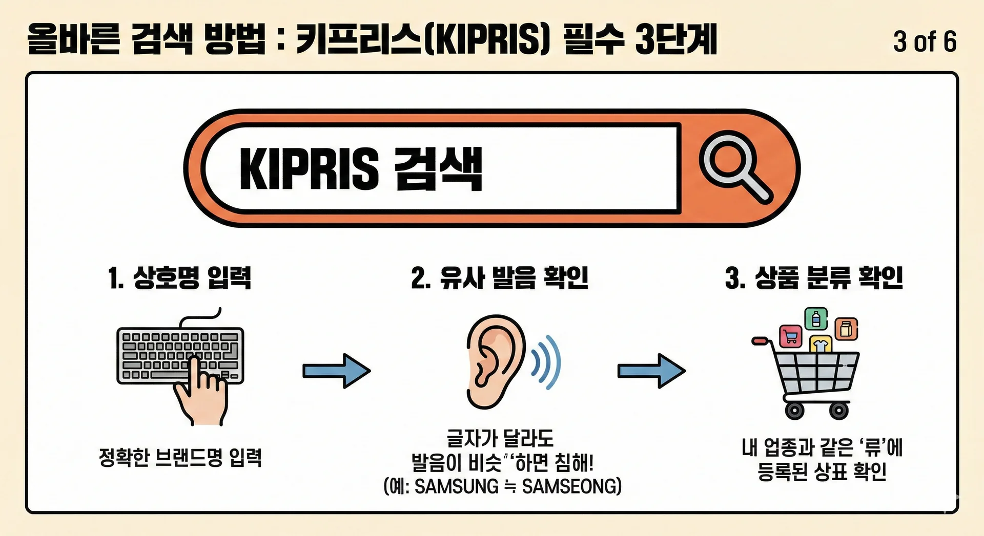 주의할 점: "검색해 봤는데 똑같은 글자가 없어서 안심했어요." 이게 가장 위험합니다. 상표법은 글자가 달라도 '발음'이나 '관념(뜻)'이 비슷하면 등록을 거절하고 침해로 간주합니다. (예: 'SAMSUNG'과 'SAMSEONG'은 글자는 다르지만 발음이 유사해 등록 불가)