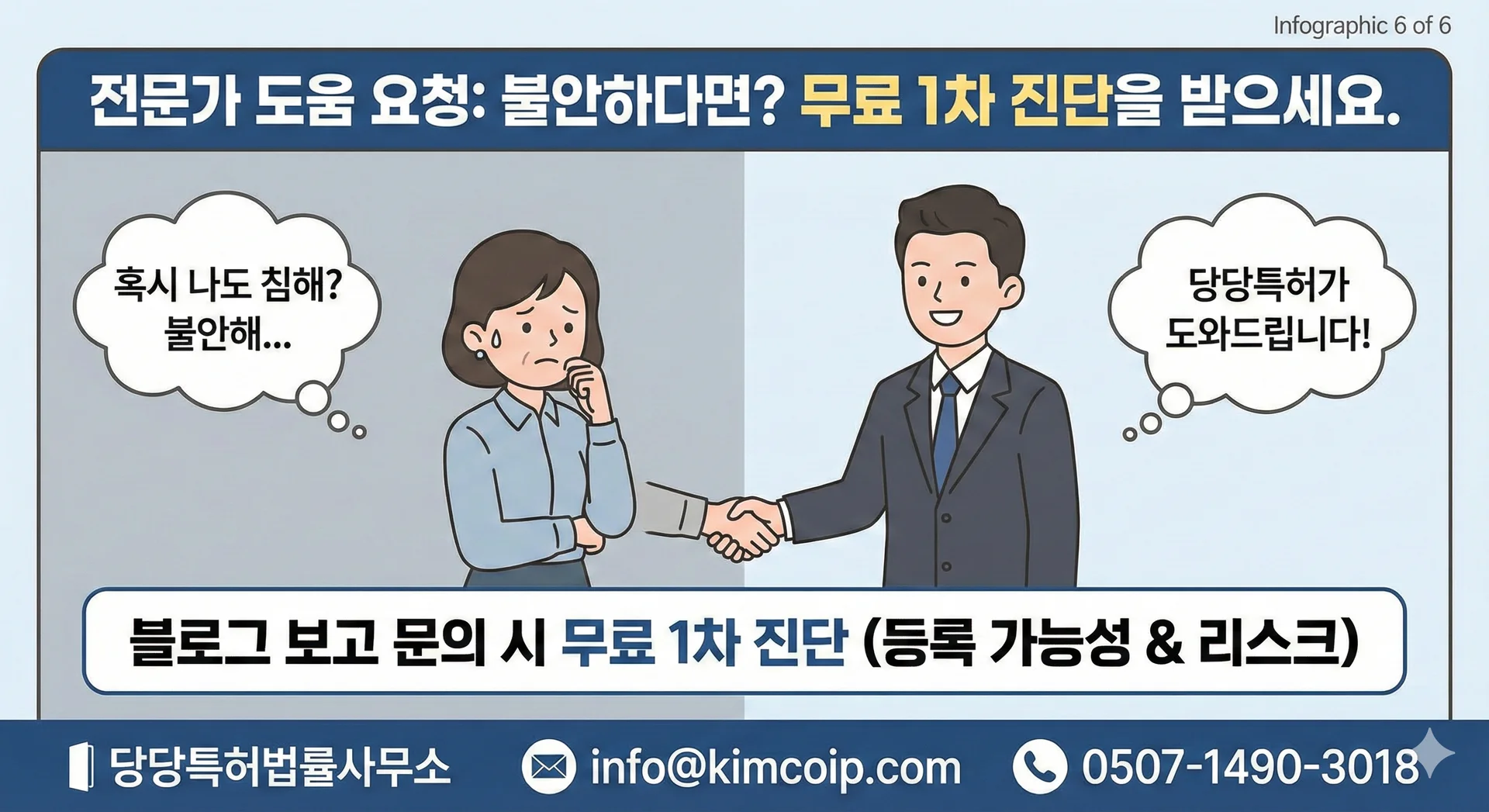 상담만 받으시고 진행은 안 하셔도 좋습니다. 적어도 몰라서 내 브랜드를 남에게 뺏기는 억울한 일만은 없으셨으면 좋겠습니다.