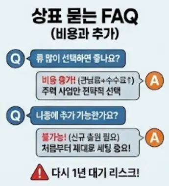 A. 이미 출원/등록이 완료된 건에 류를 끼워 넣을 수는 없습니다. 새로운 류에 대해 별도로 신규 출원을 해야 합니다. 이때 다시 1년의 심사 기간을 기다려야 하고, 그 사이에 다른 사람이 해당 류를 선점했을 위험도 있습니다. 그래서 처음 할 때 제대로 세팅하는 것이 중요합니다.