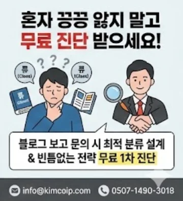 "블로그 보고 상표분류 문의드립니다"라고 말씀해 주시면, 제가 직접 전산망을 통해 대표님 사업에 딱 맞는 최적의 분류 설계와 빈틈없는 권리 확보 전략을 무료로 1차 진단해 드리겠습니다.