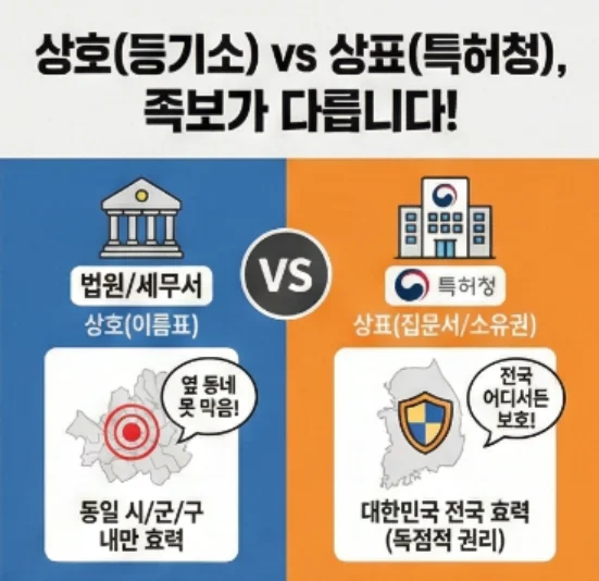 • 상호 (등기소/세무서): '상호'는 사업자의 이름표입니다. 인터넷 등기소에서 검색합니다. 하지만 치명적인 단점은 효력이 '동일 시/군/구' 내에만 미친다는 것입니다. 즉, 서울 강남구에 '대박식당'을 등록해도, 바로 옆 서초구에서 누군가 똑같은 이름을 써도 막을 수 없습니다.
