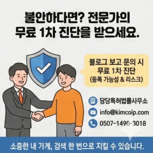 "블로그 보고 상표명검색 문의드립니다"라고 말씀해 주시면, 제가 직접 전산망을 통해 대표님 상호의 등록 가능성과 숨어있는 유사 상표 리스크를 무료로 1차 진단해 드리겠습니다.